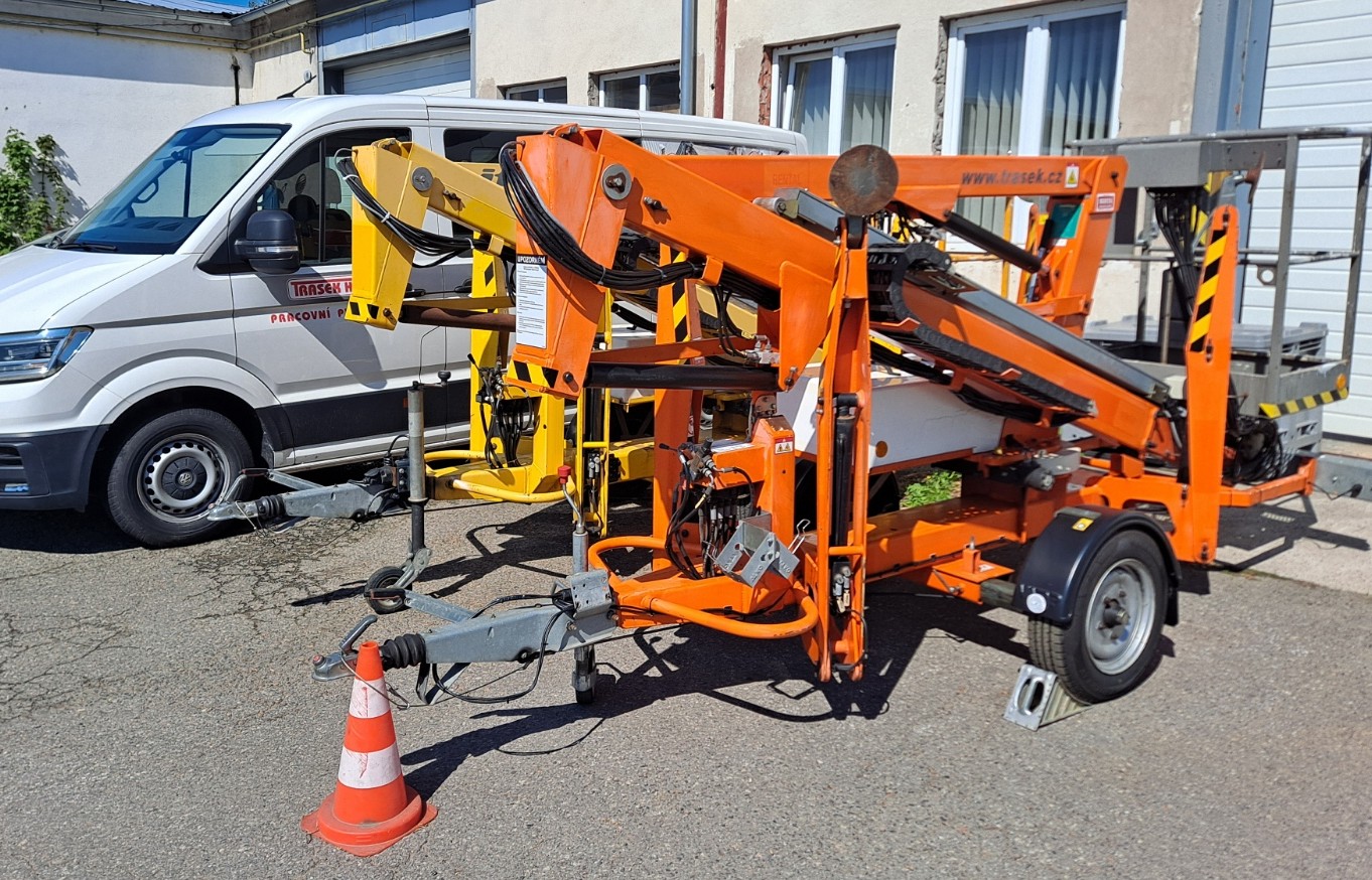 Prodáme použitou přívěsnou plošinu Nifty 120TAC, r.v. 2014, pohon 230V. Pracovní výška 12,2m, boční dosah 6,2m, nosnost koše 200 kg, celková váha 1340 kg, zatahovací podvozek na šířku 1,1 m. Hydraulické opěry. Cena 358.000 Kč bez DPH. V ceně celková kontrola plošiny a výměna vadných dílů. Nová STK. Nové veškeré revize.