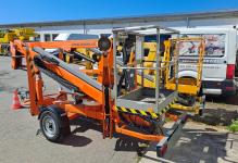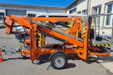 Prodáme použitou přívěsnou kloubovou plošinu NiftyLift 170HE, r.v. 2012, pohon baterie. Pracovní výška 17,2 m, boční dosah 8,8 m, nosnost koše 200 kg, celková váha 1990 kg, Nové veškeré revize. Podpora servisu a náhradních dílů. Cena 463.000 Kč bez DPH. V ceně nové baterie!
